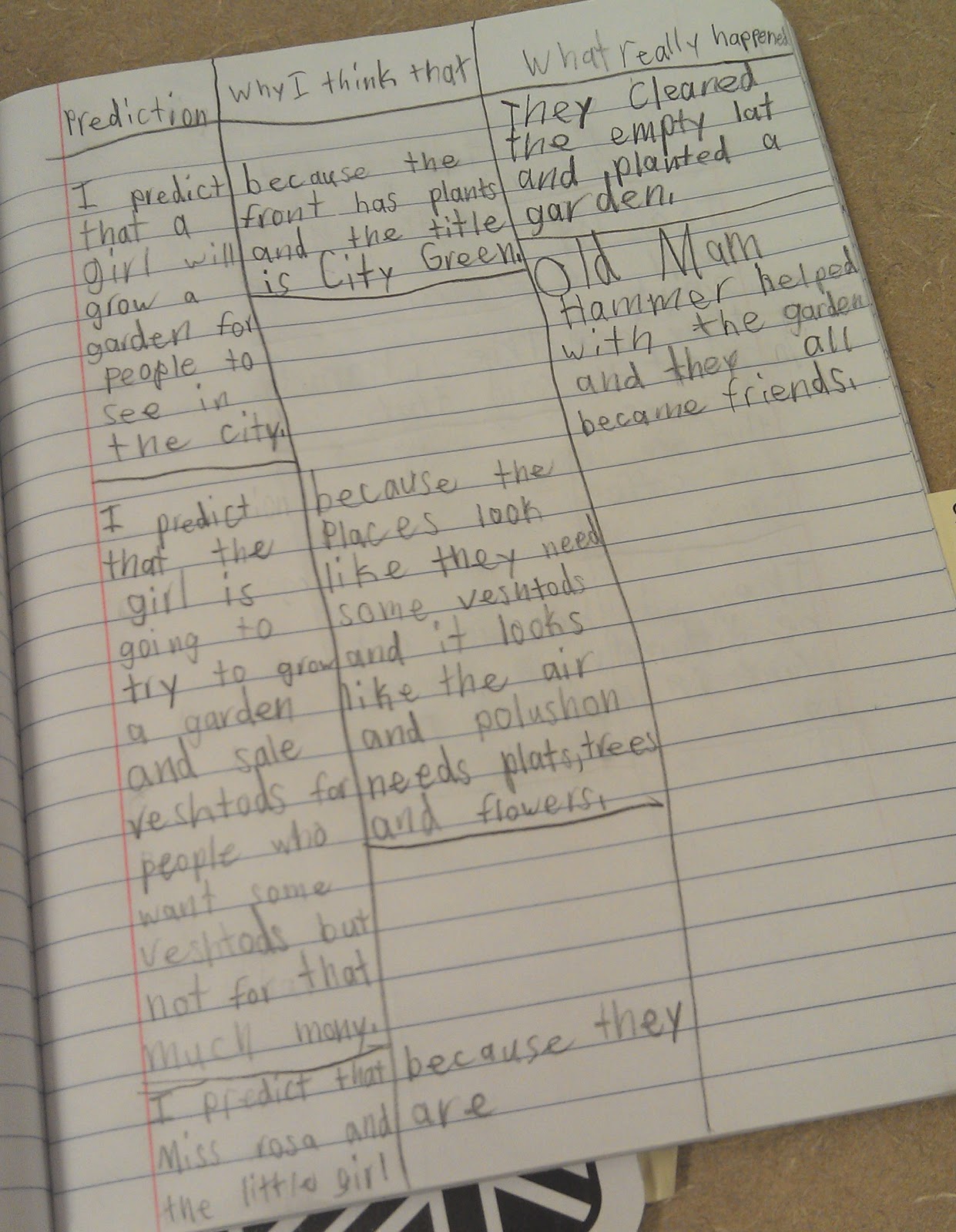 Then students read City Green by DyAnne DiSalvo-Ryan. With this book, students read a few pages at a time independently in a whisper read as I went around and listened. At this time, I assisted students with any word problem-solving. Students also created a chart similar to the anchor chart in the "Strategies" section of their reader's notebooks. As they read, they recorded their predictions, evidence for the prediction, and what really happened. When I listened to each student read, I also reviewed their prediction chart with them.