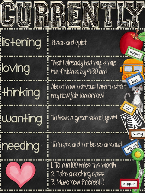 I loved reading your Currently! I had to smile at your goal of running 100 miles this month. Mine is to run twice a week! Good luck at your new job!! I hope it goes well!!